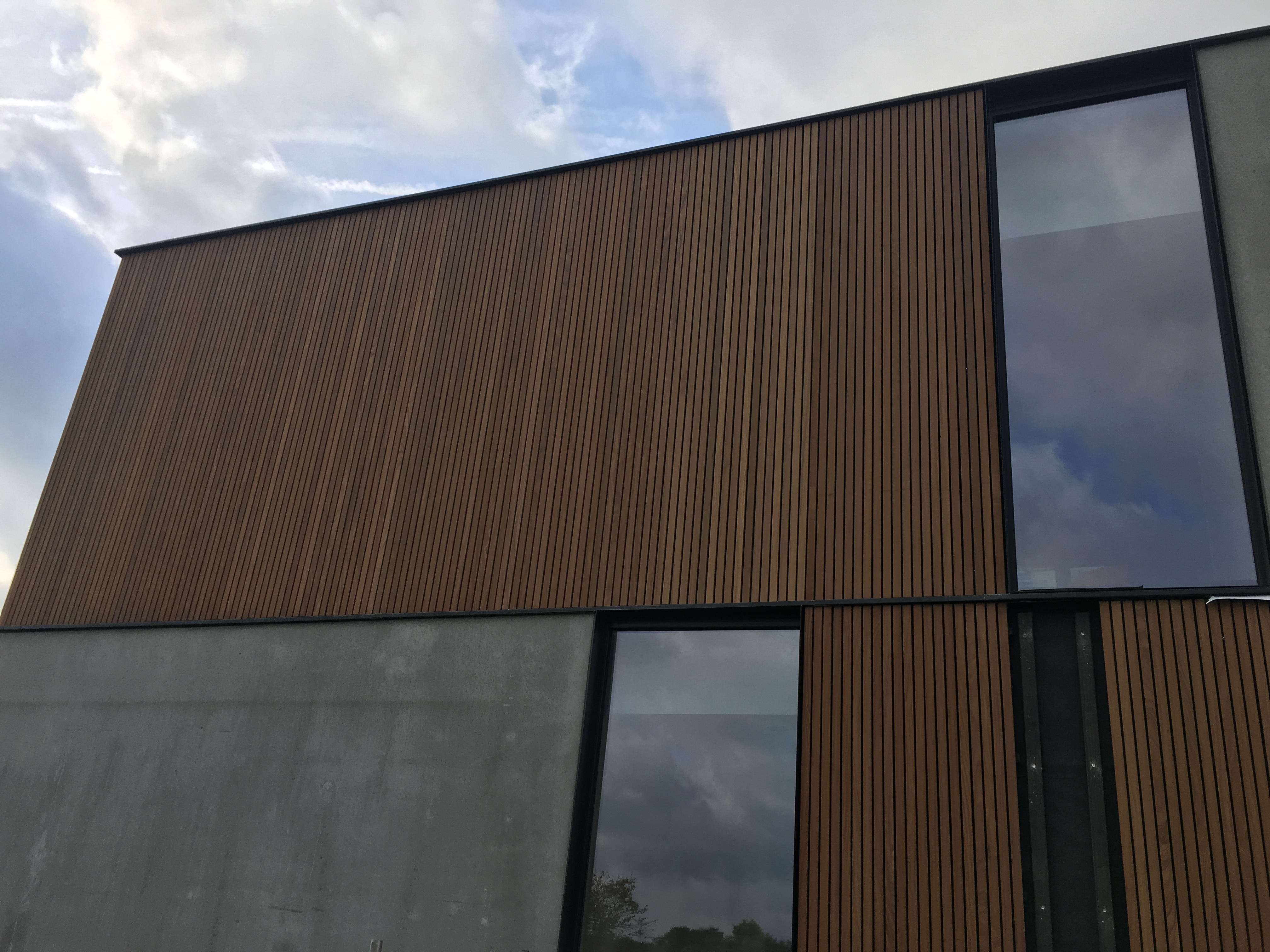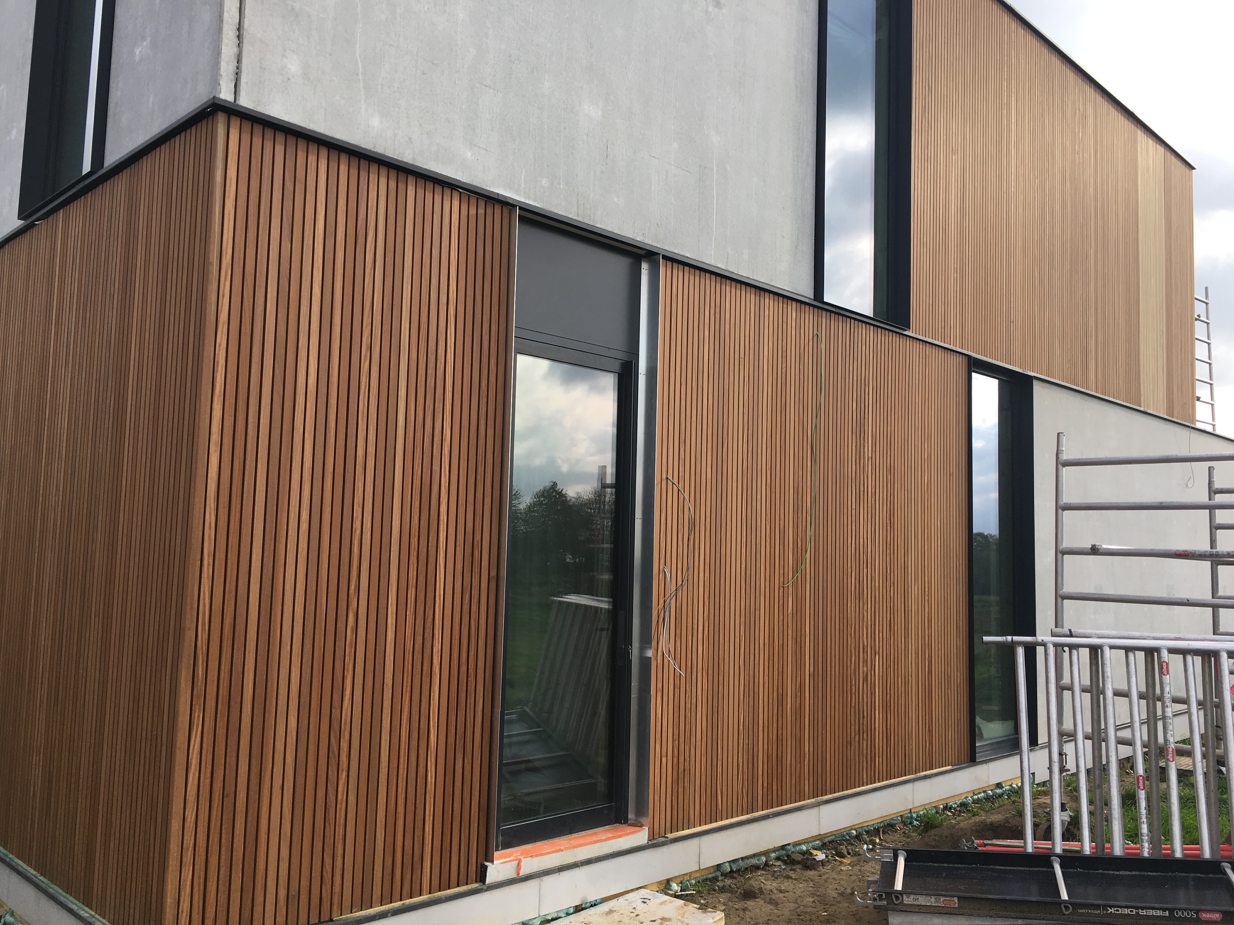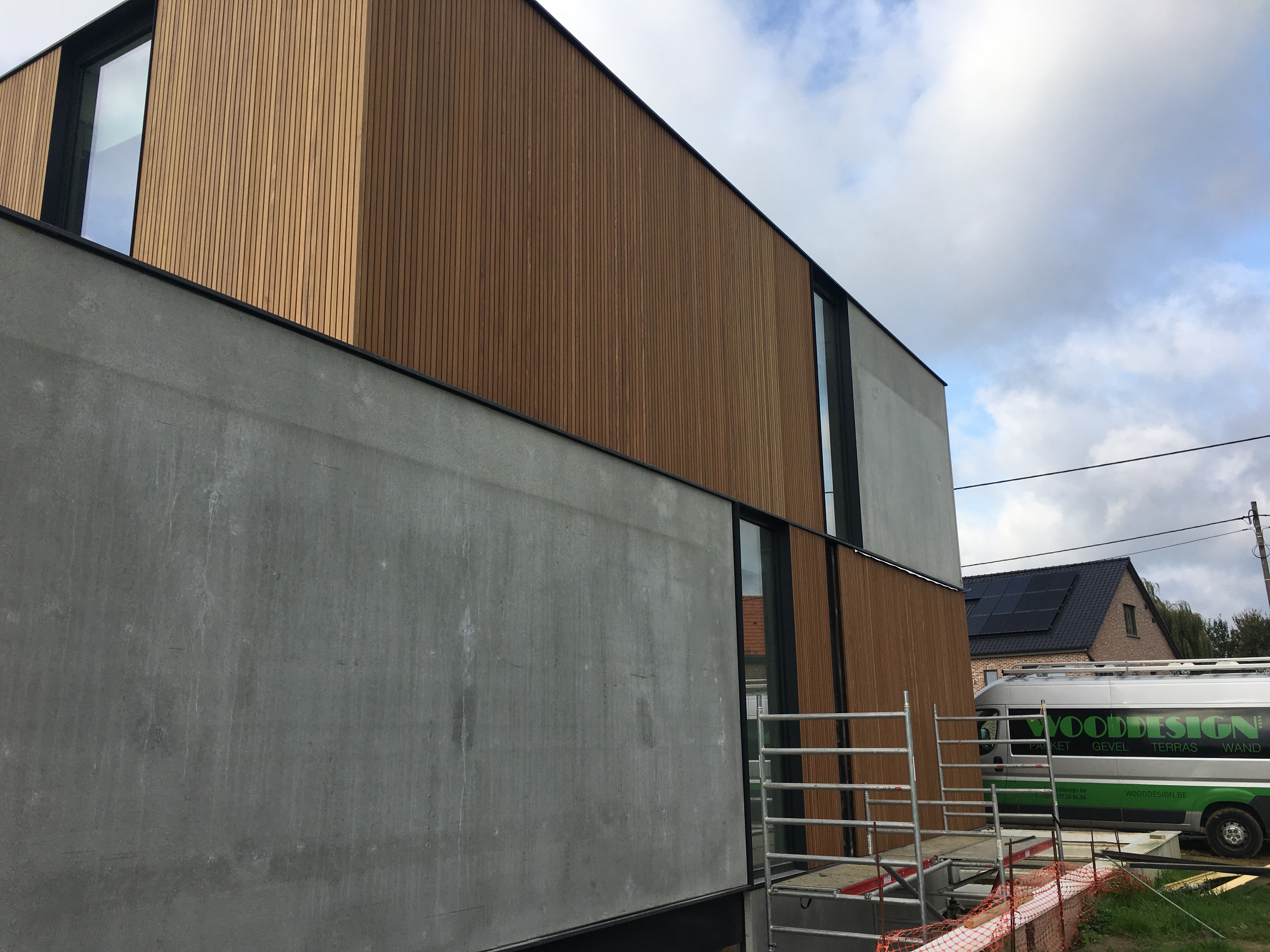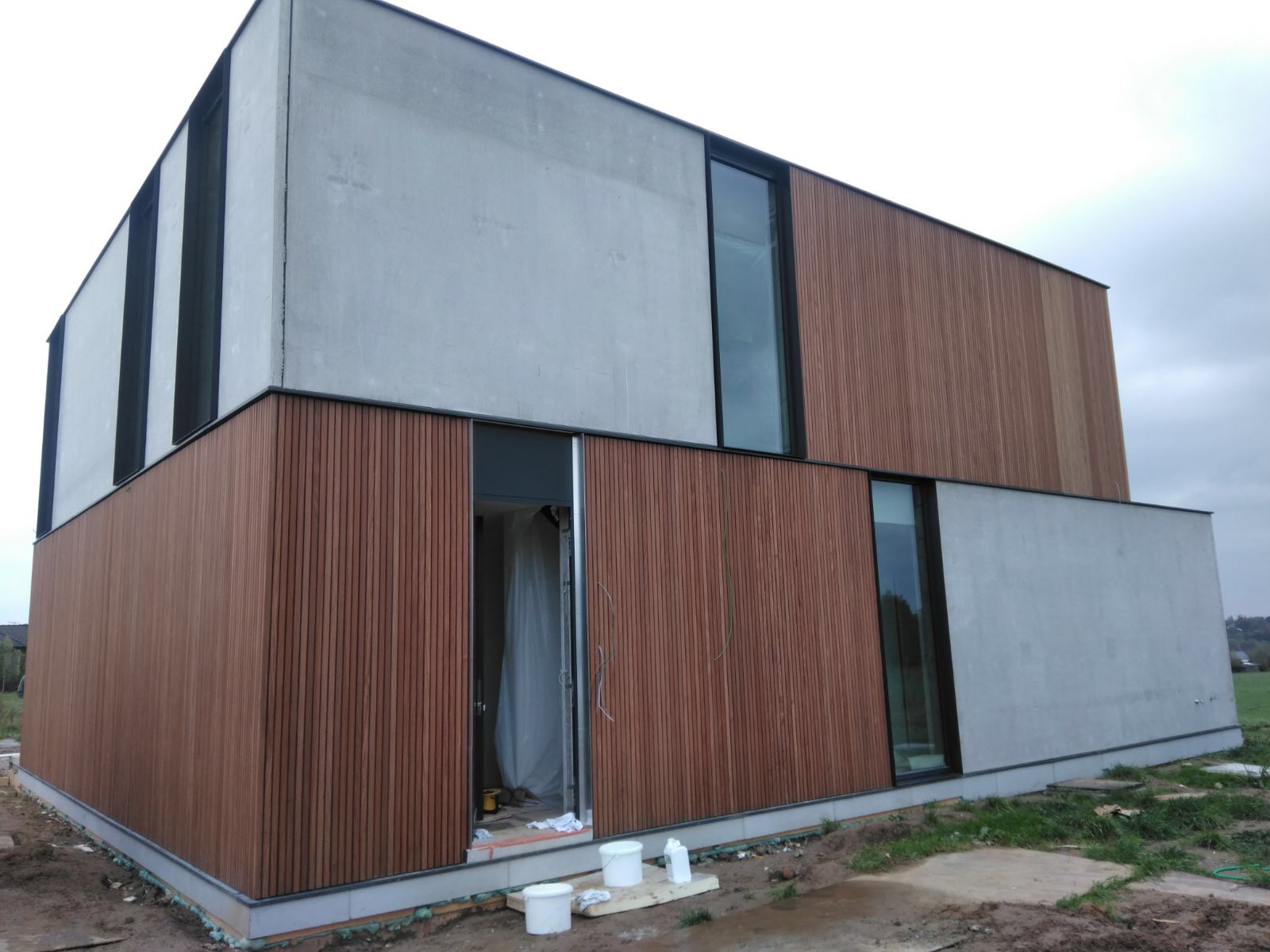 Deze nieuwbouwwoning van fotograaf Jan Cornelis werd, iov Concrete House, afgewerkt met een houten gevelbekleding in afrormosia. Dit is een zeer stabiele mooi vergrijzende houtsoort uit de duurdere prijsklasse. Hier werd gekozen voor een verticale blinde bevestiging die met de tijd mooi zal vergrijzen. De verticale plaatsing heeft ook als voordeel dat het regenwater beter afvloeit, met als gevolg een mooiere vergrijzing en langere levensduur.