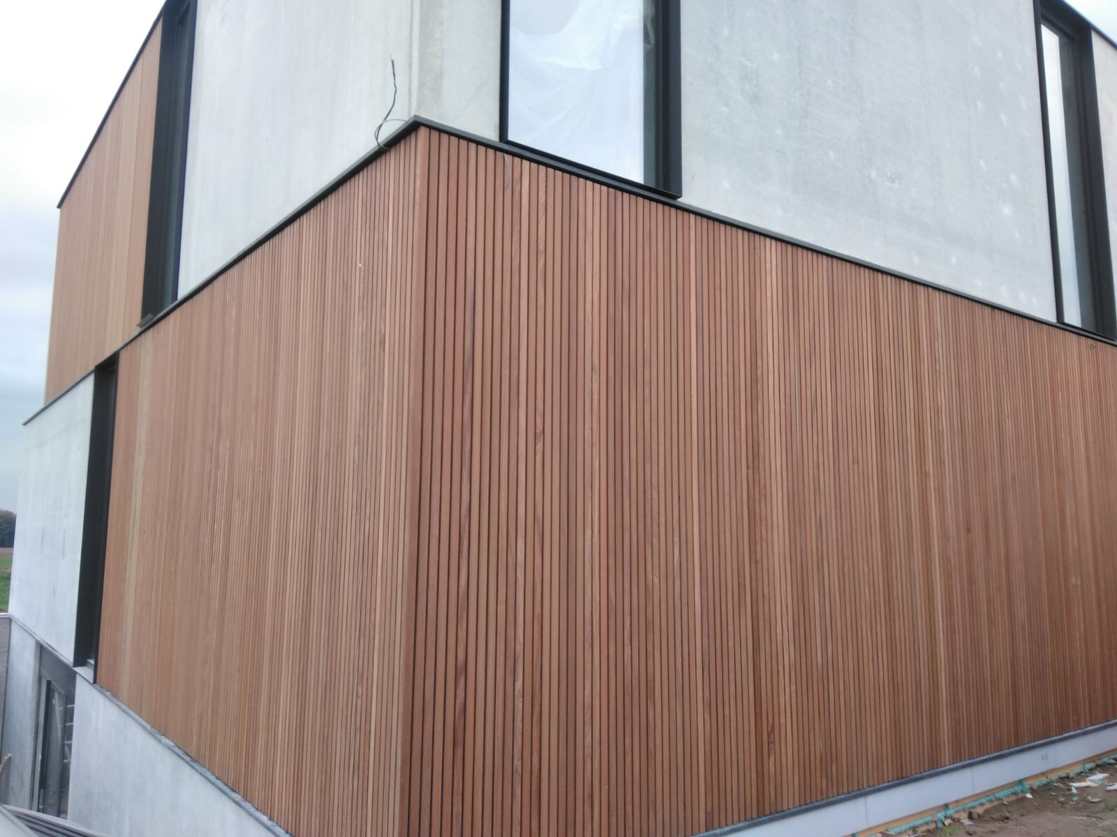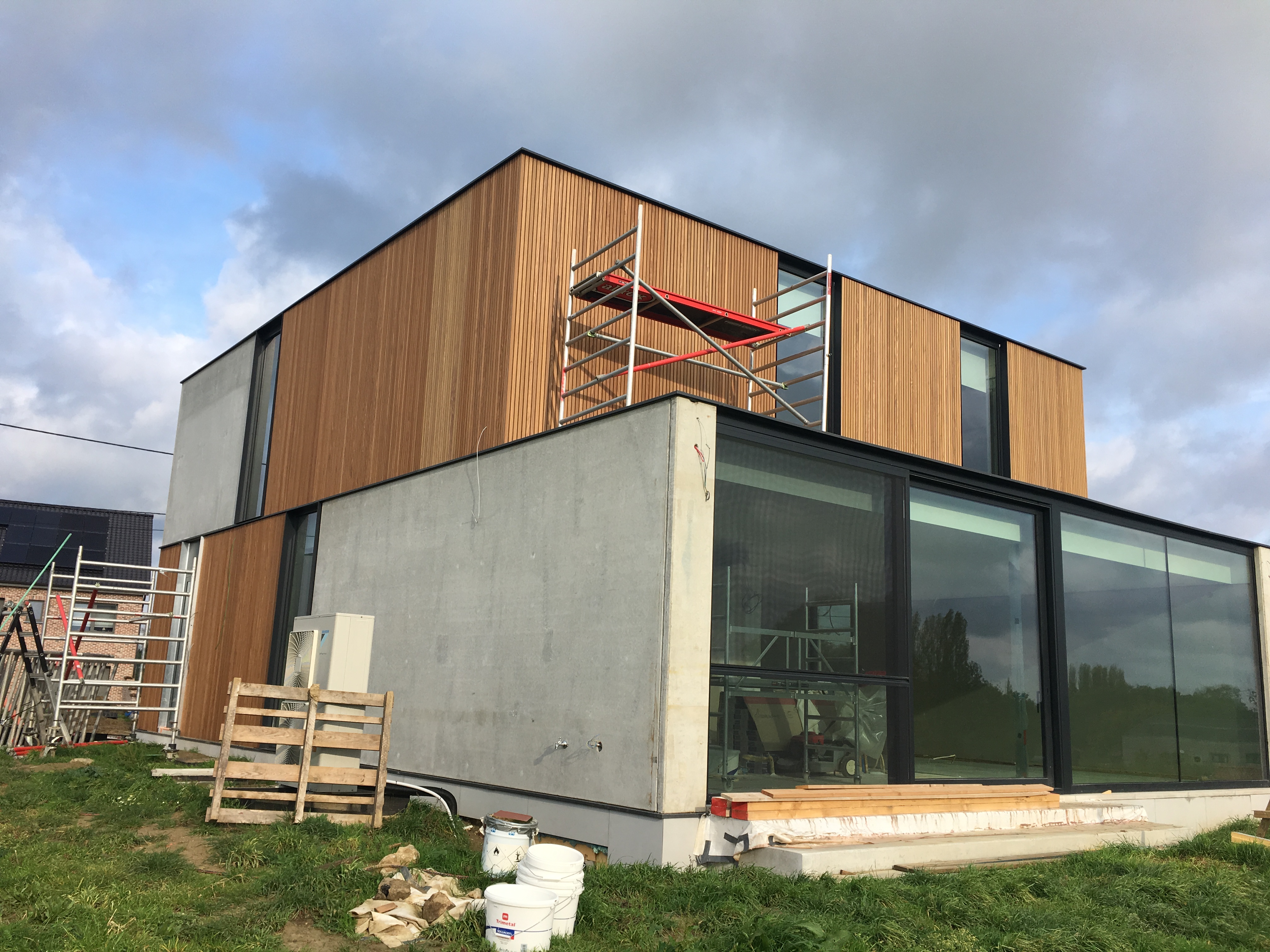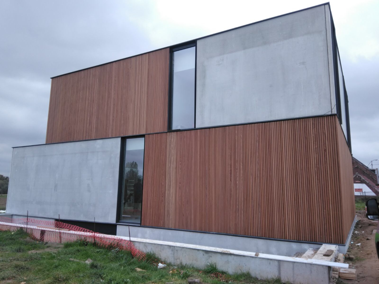 Deze nieuwbouwwoning van fotograaf Jan Cornelis werd, iov Concrete House, afgewerkt met een houten gevelbekleding in afrormosia. Dit is een zeer stabiele mooi vergrijzende houtsoort uit de duurdere prijsklasse. Hier werd gekozen voor een verticale blinde bevestiging die met de tijd mooi zal vergrijzen. De verticale plaatsing heeft ook als voordeel dat het regenwater beter afvloeit, met als gevolg een mooiere vergrijzing en langere levensduur.