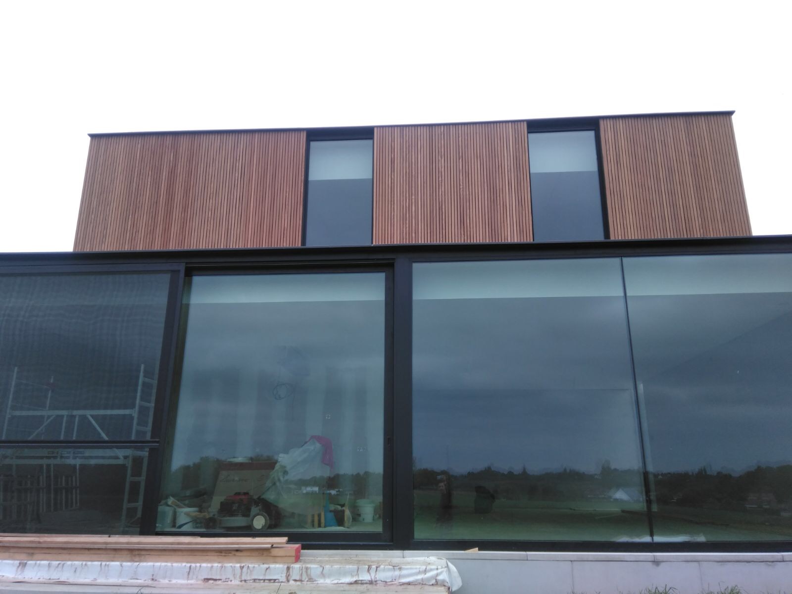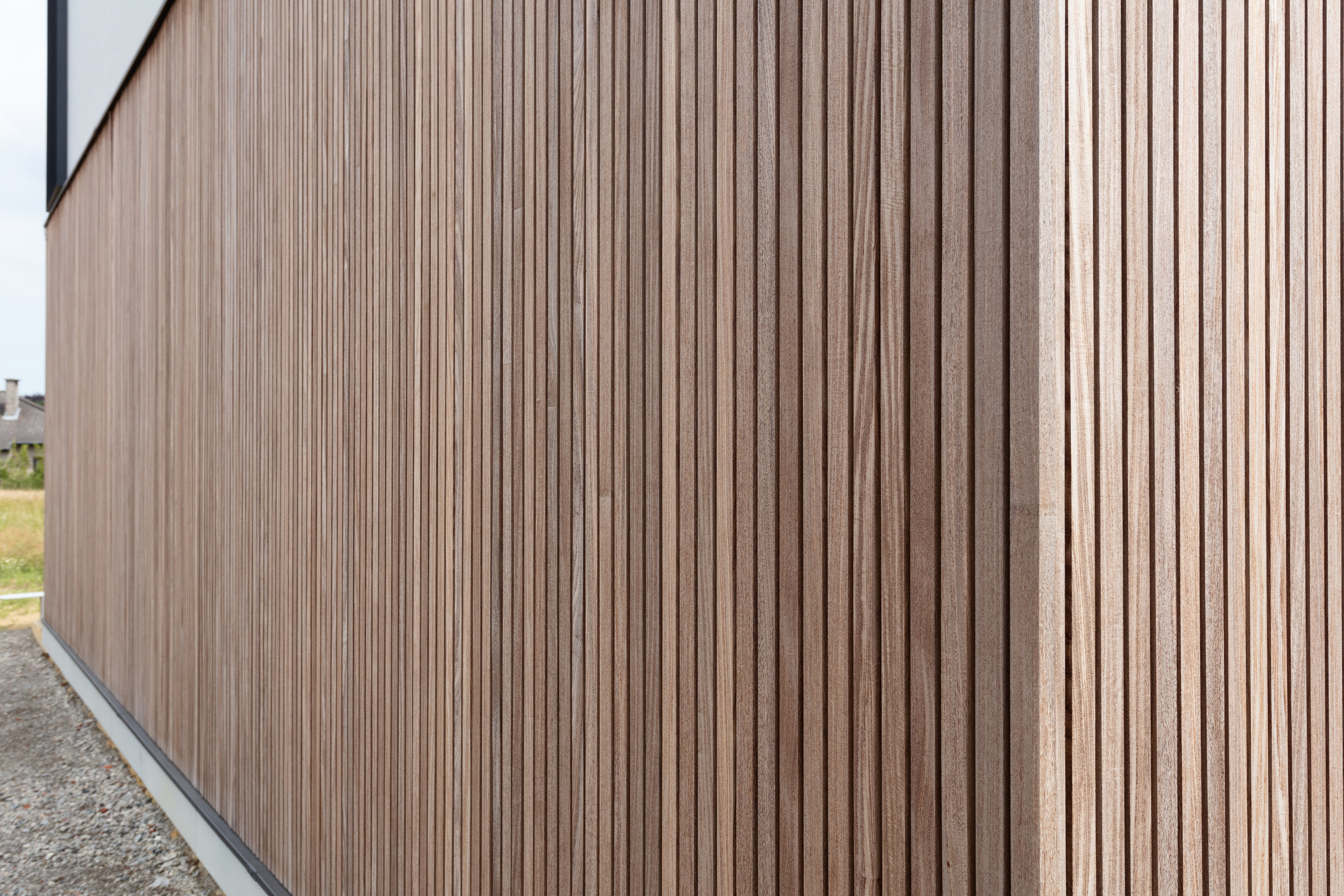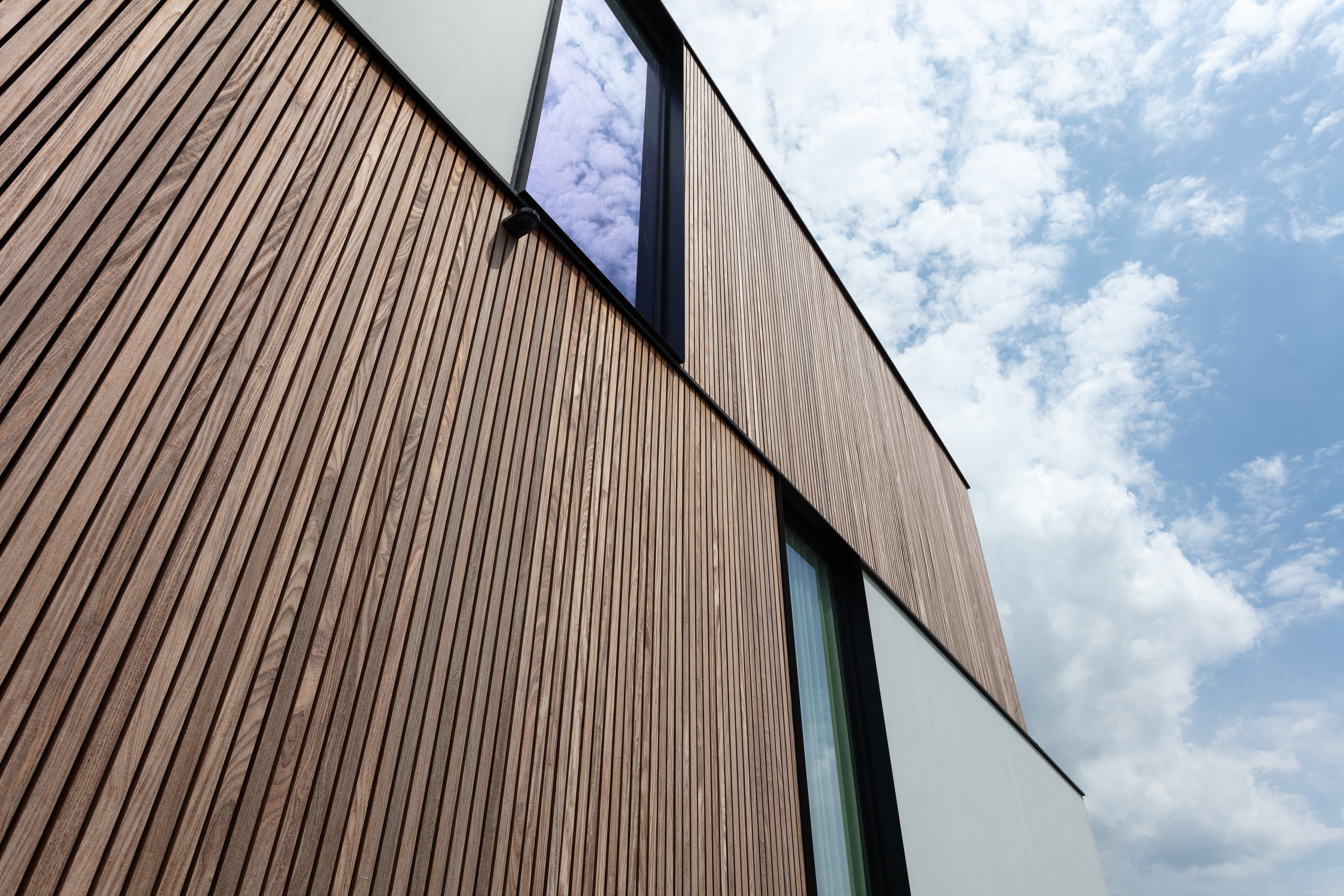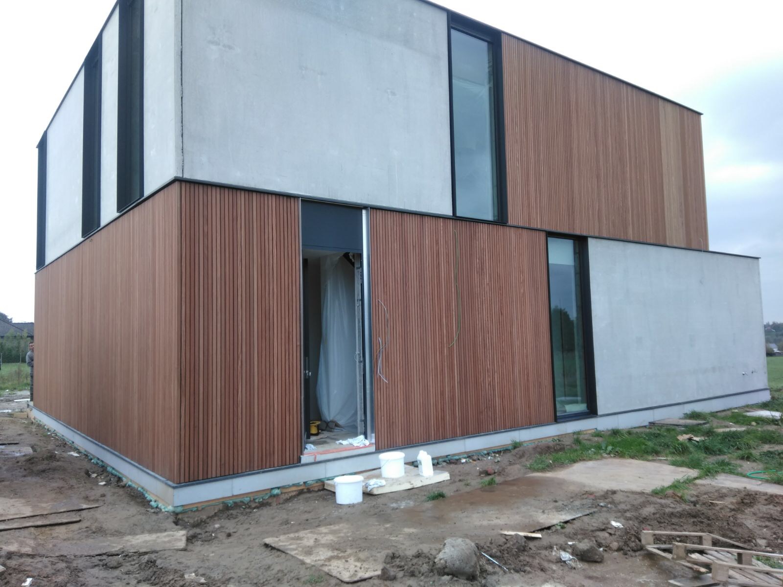 Deze nieuwbouwwoning van fotograaf Jan Cornelis werd, iov Concrete House, afgewerkt met een houten gevelbekleding in afrormosia. Dit is een zeer stabiele mooi vergrijzende houtsoort uit de duurdere prijsklasse. Hier werd gekozen voor een verticale blinde bevestiging die met de tijd mooi zal vergrijzen. De verticale plaatsing heeft ook als voordeel dat het regenwater beter afvloeit, met als gevolg een mooiere vergrijzing en langere levensduur.