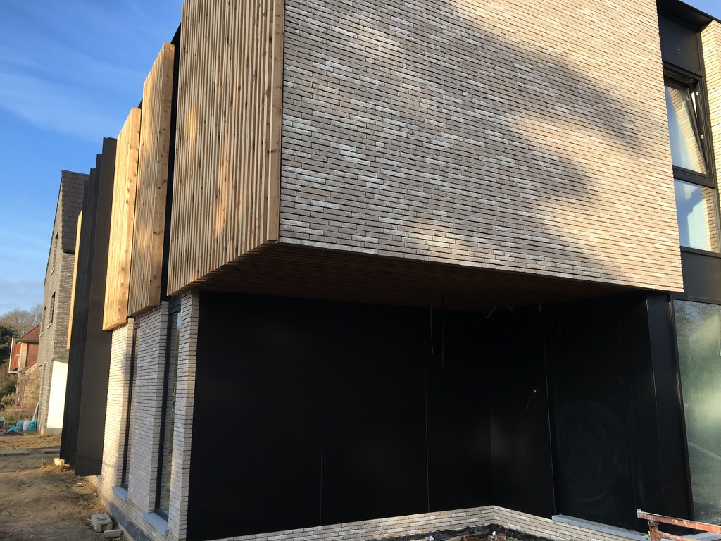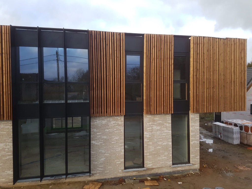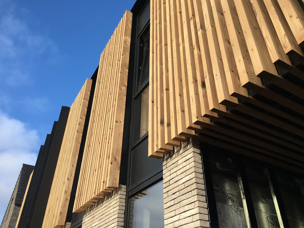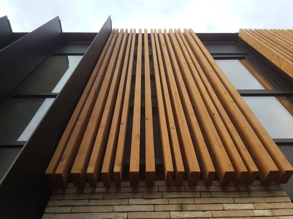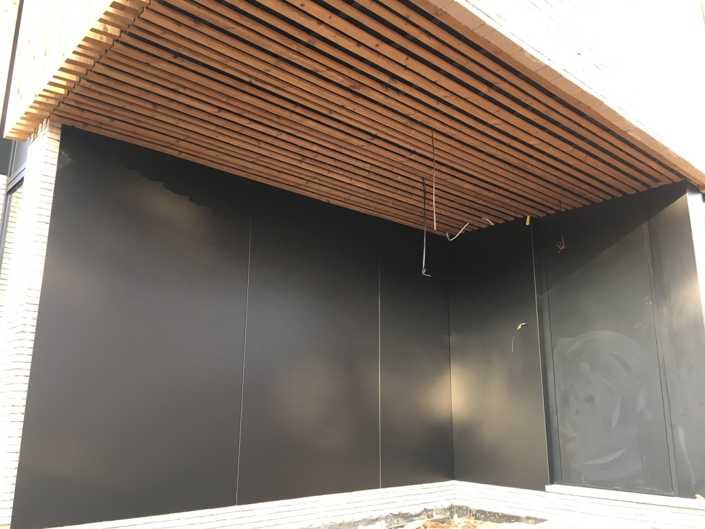 Bij deze particuliere klant plaatsten we op maat geproduceerde balken in Thermo Vuren op gevel en plafond in wisselende breedtes. De gevel van de carport werd bekleed met volkern panelen, verlijmd op een geventileerd regelwerk.