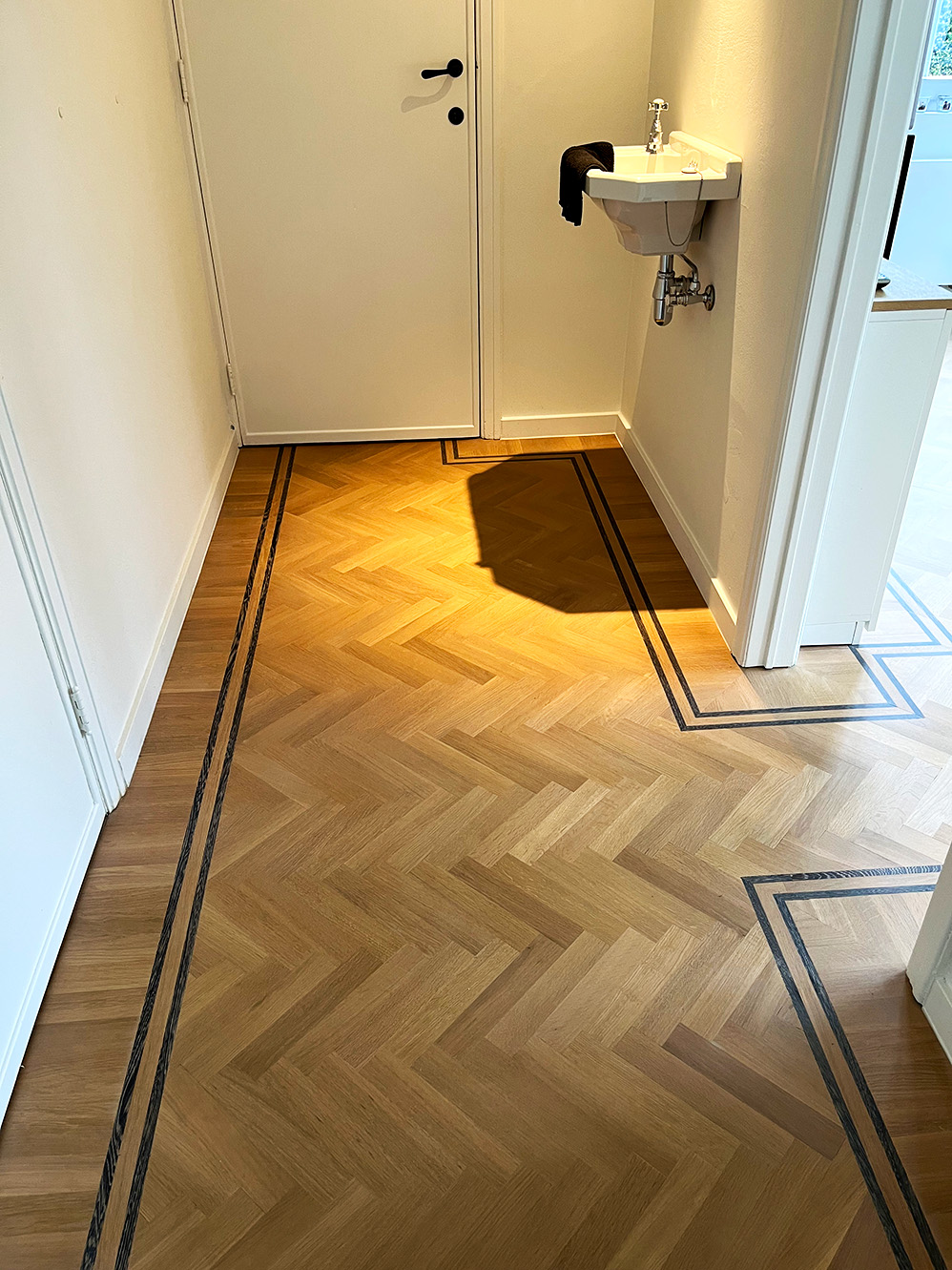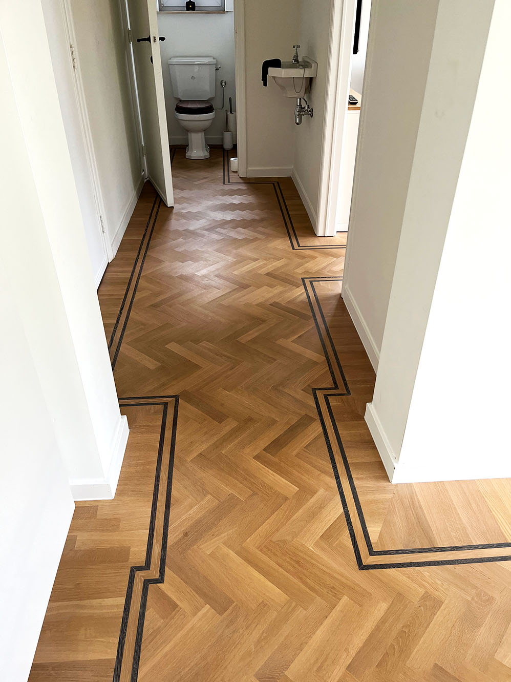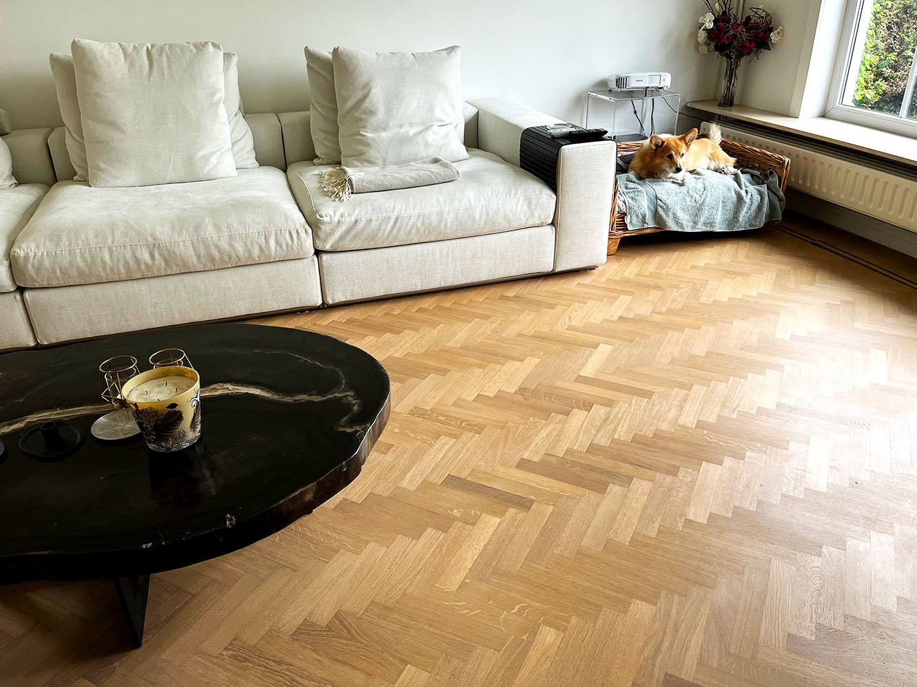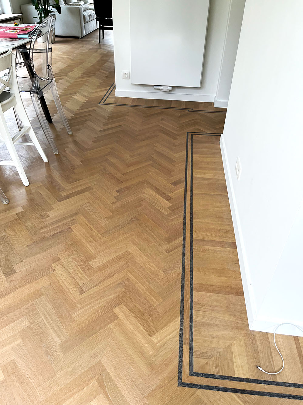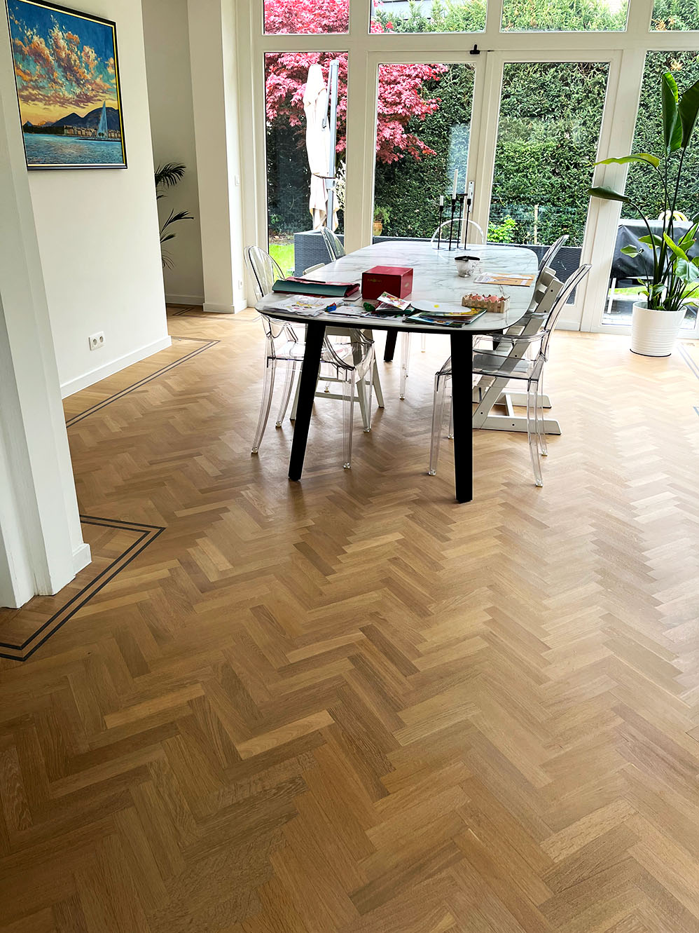 Eiken visgraatparket met boord in wengé, afgewerkt met de Rubio Monocoat Oil Plus 2C Natural