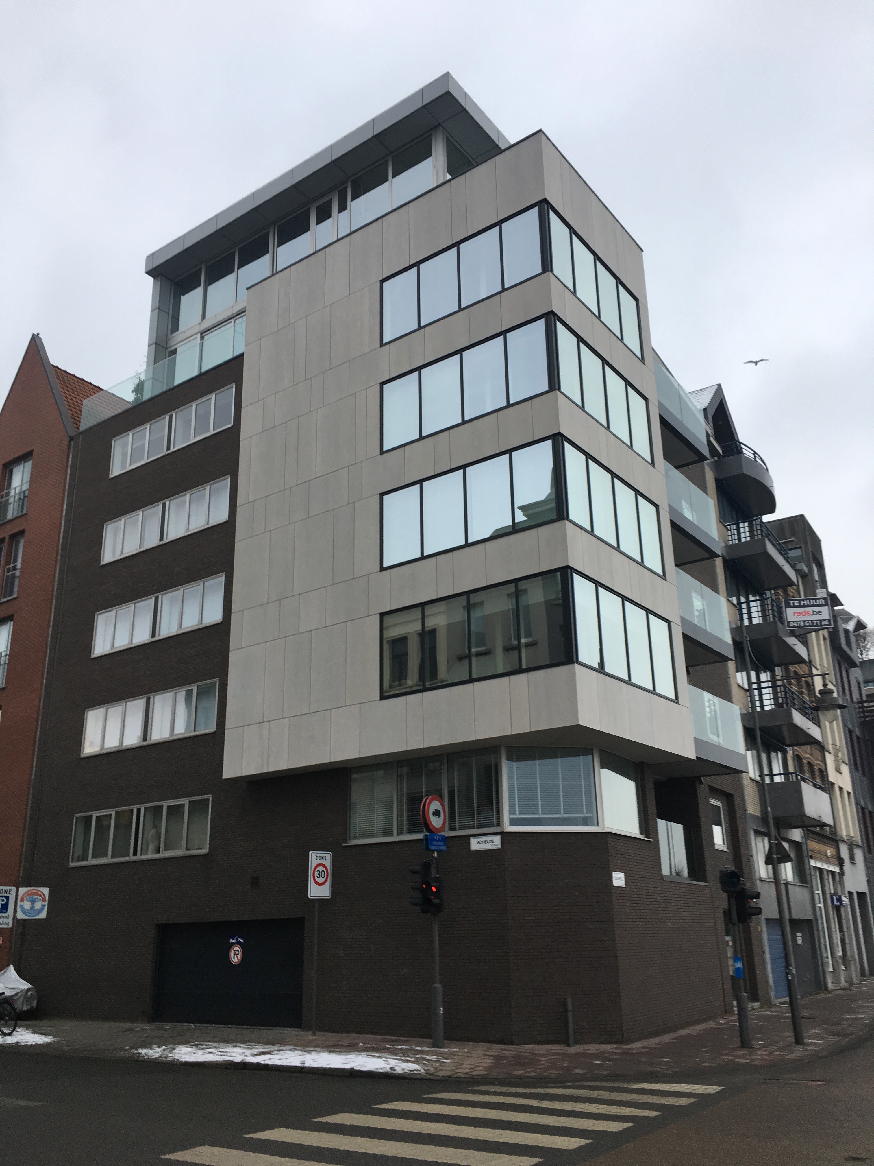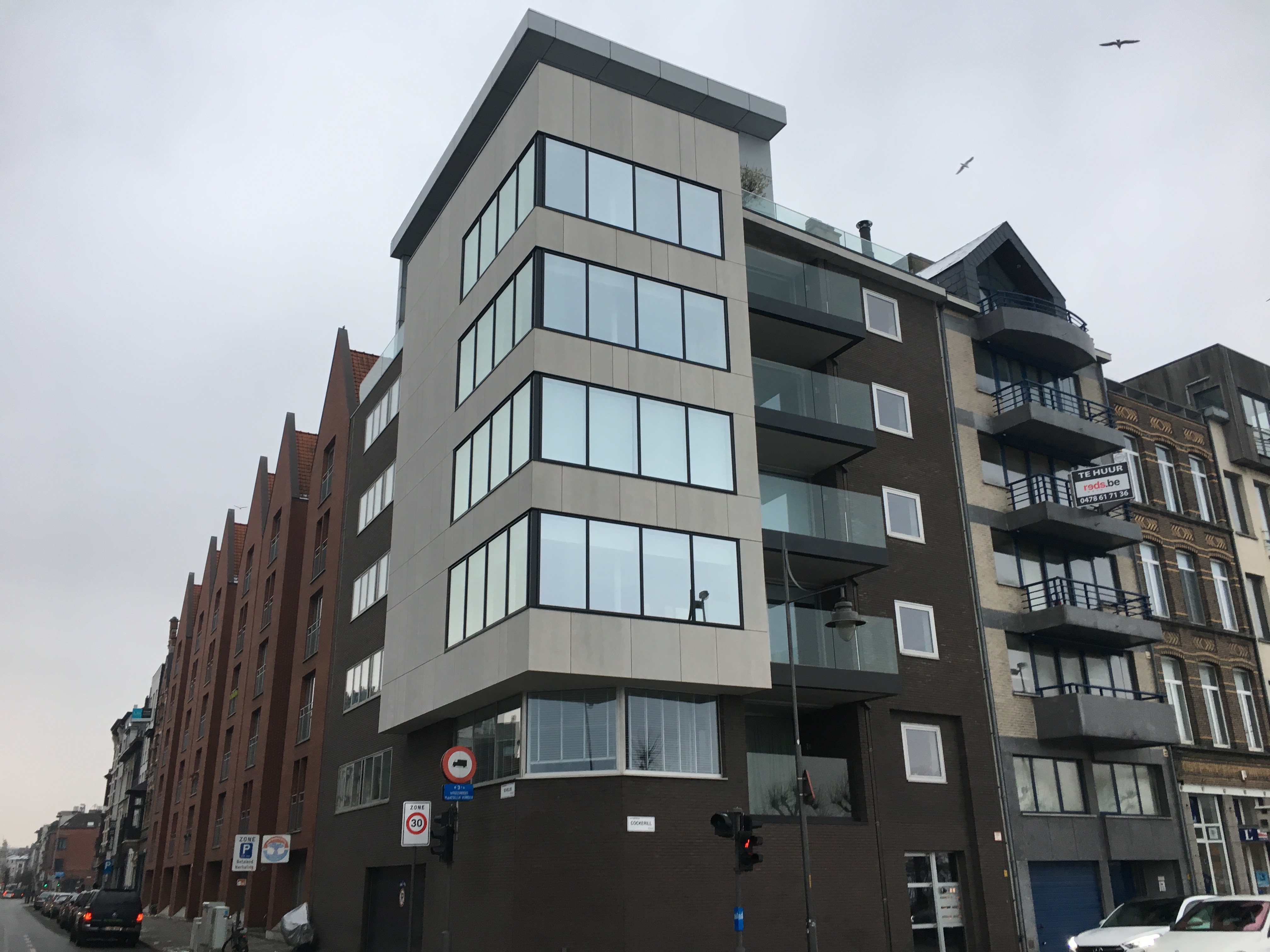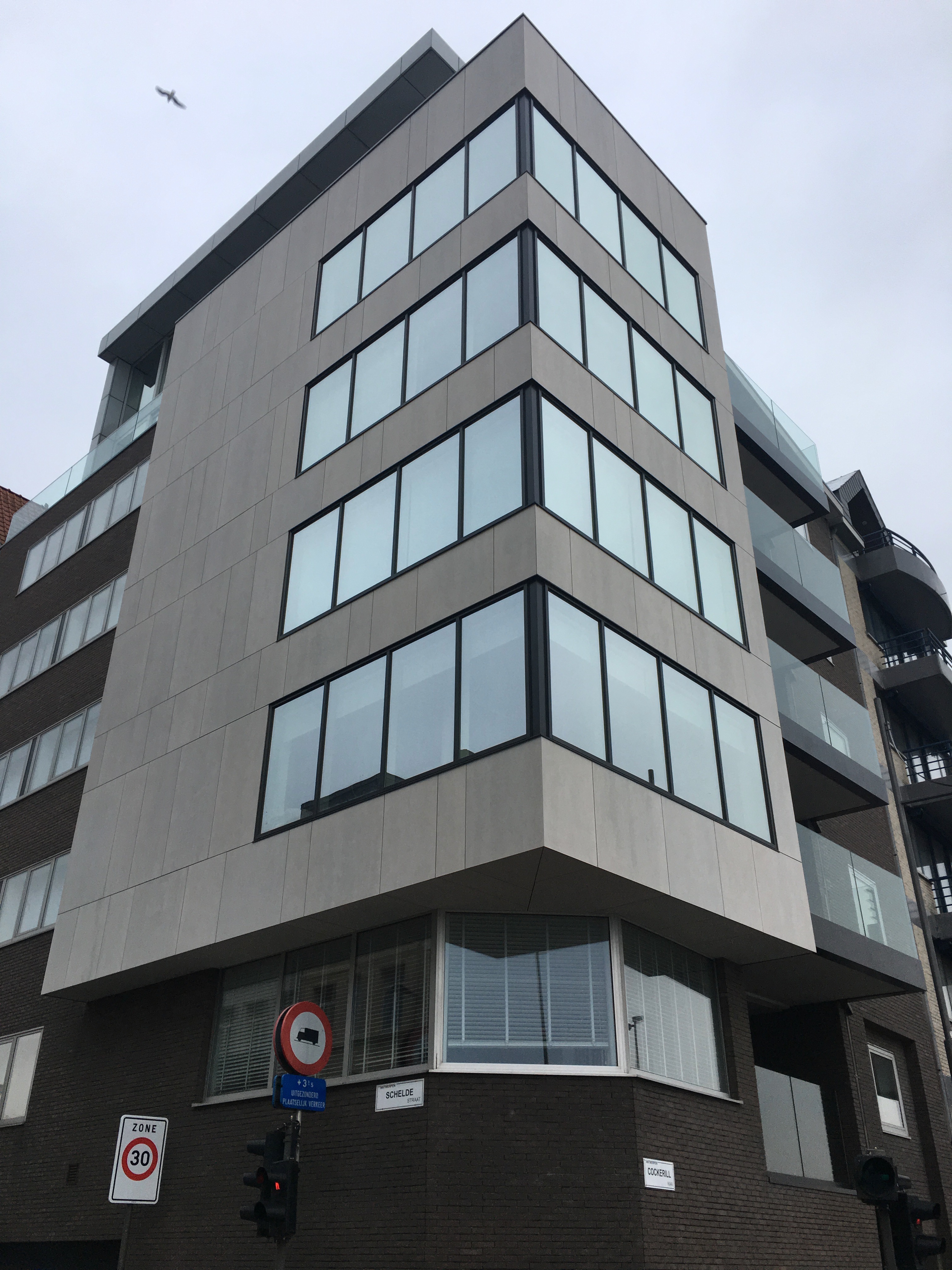 Eternit Equitone Tectiva – Scheldekaaien Antwerpen. Op de hoek van de Scheldestraat en de Cockerillkaai te Antwerpen, hebben we de gevel van deze appartementsblok volledig gestript en terug bekleed. De rotswolisolatie werd vervangen door Kingspan Kooltherm, de houten regels door het Isofinish systeem met gevelschroeven van Borgh, en de multiplex door vezelcementplaten van Eternit. Er werd een zwart regenscherm Tyvek UV-Facade achter de bekleding geplaatst. De gevelplaten werden blind bevestigd op het houten regelwerk met het Innotec lijmsysteem. De waterdichting aan de ramen werd volledig nagezien en indien nodig ook vervangen. Detail: de voegen van de verlijmde plafondbekleding lopen volledig in lijn met die van de gevel