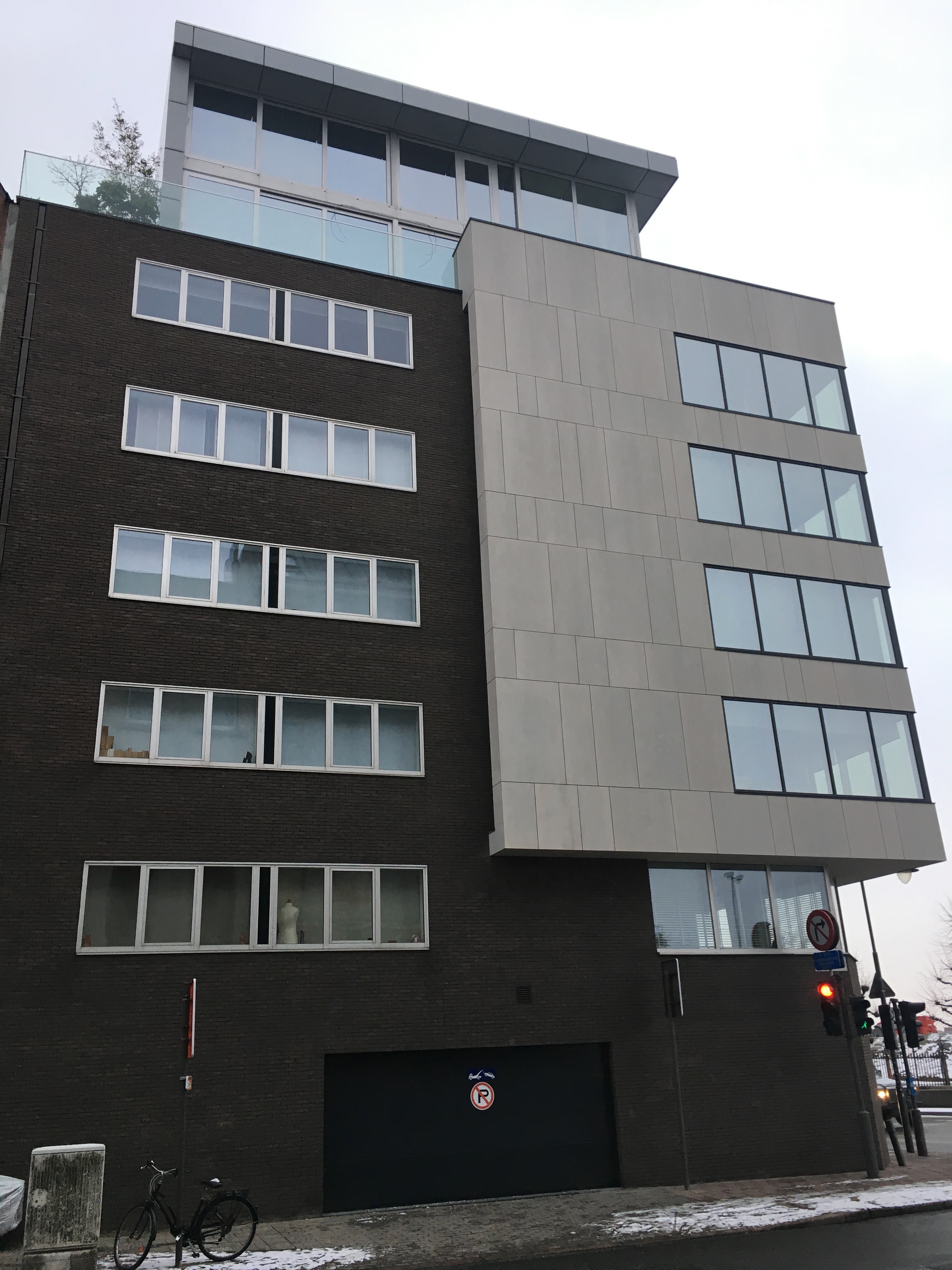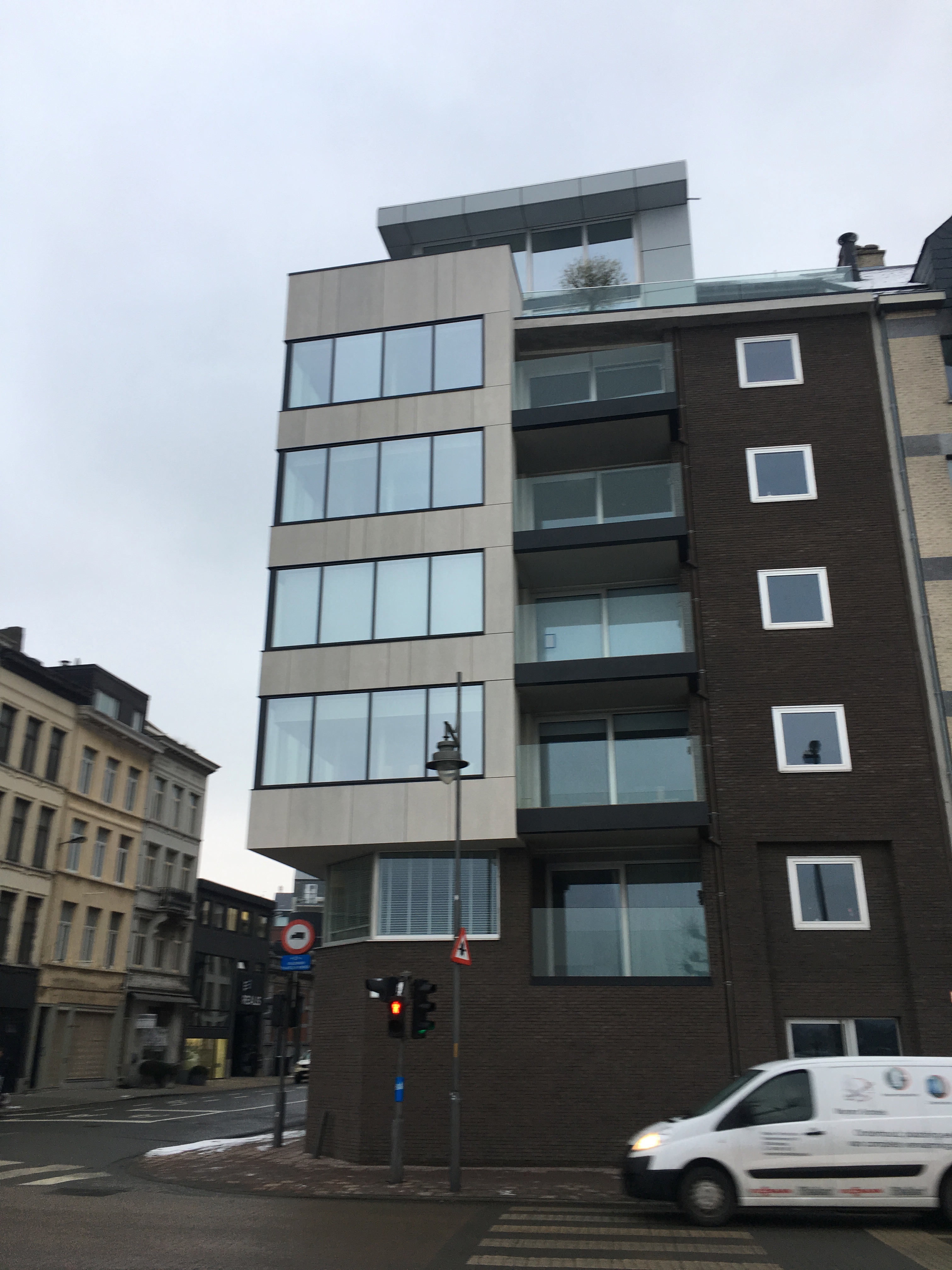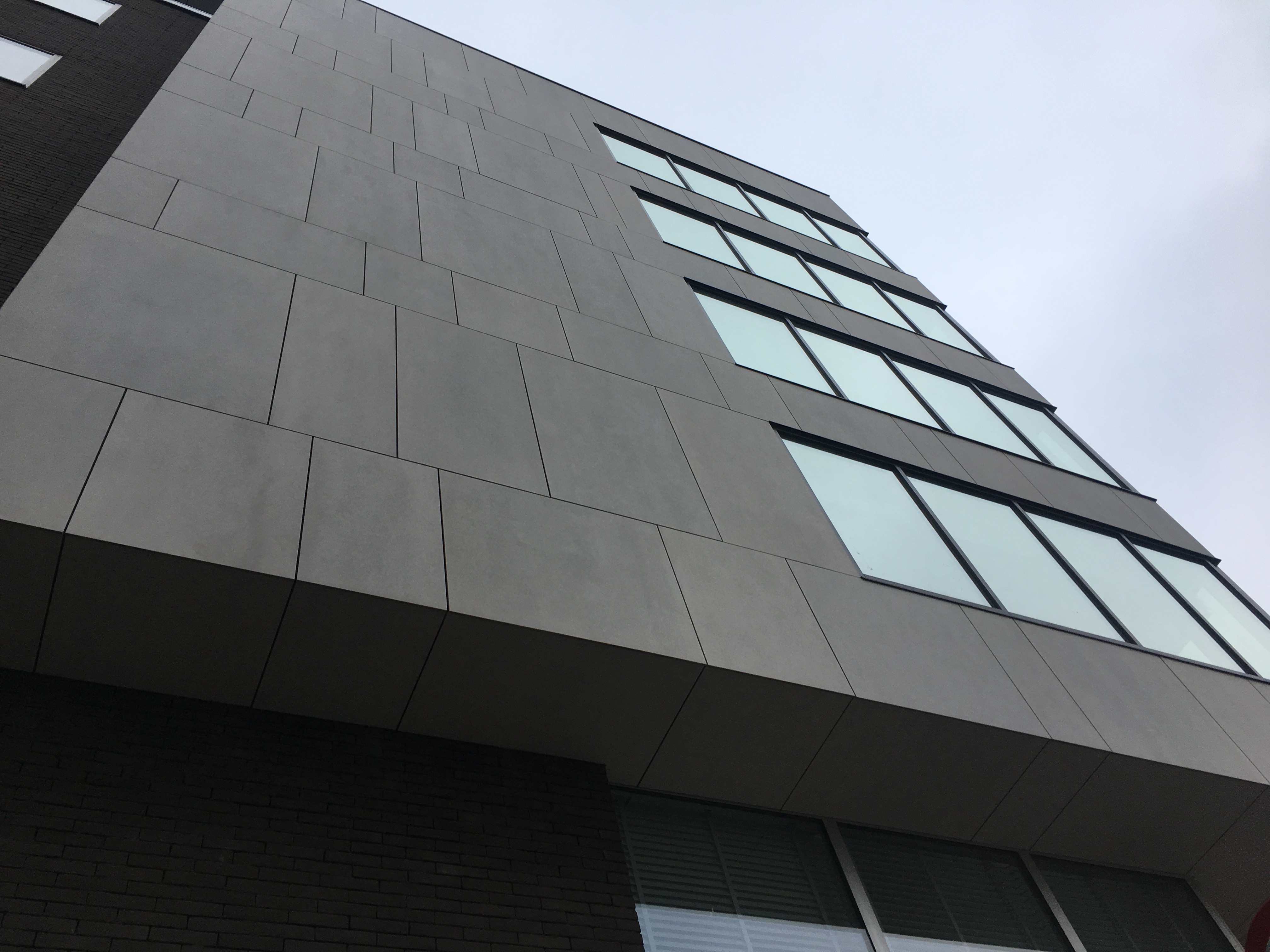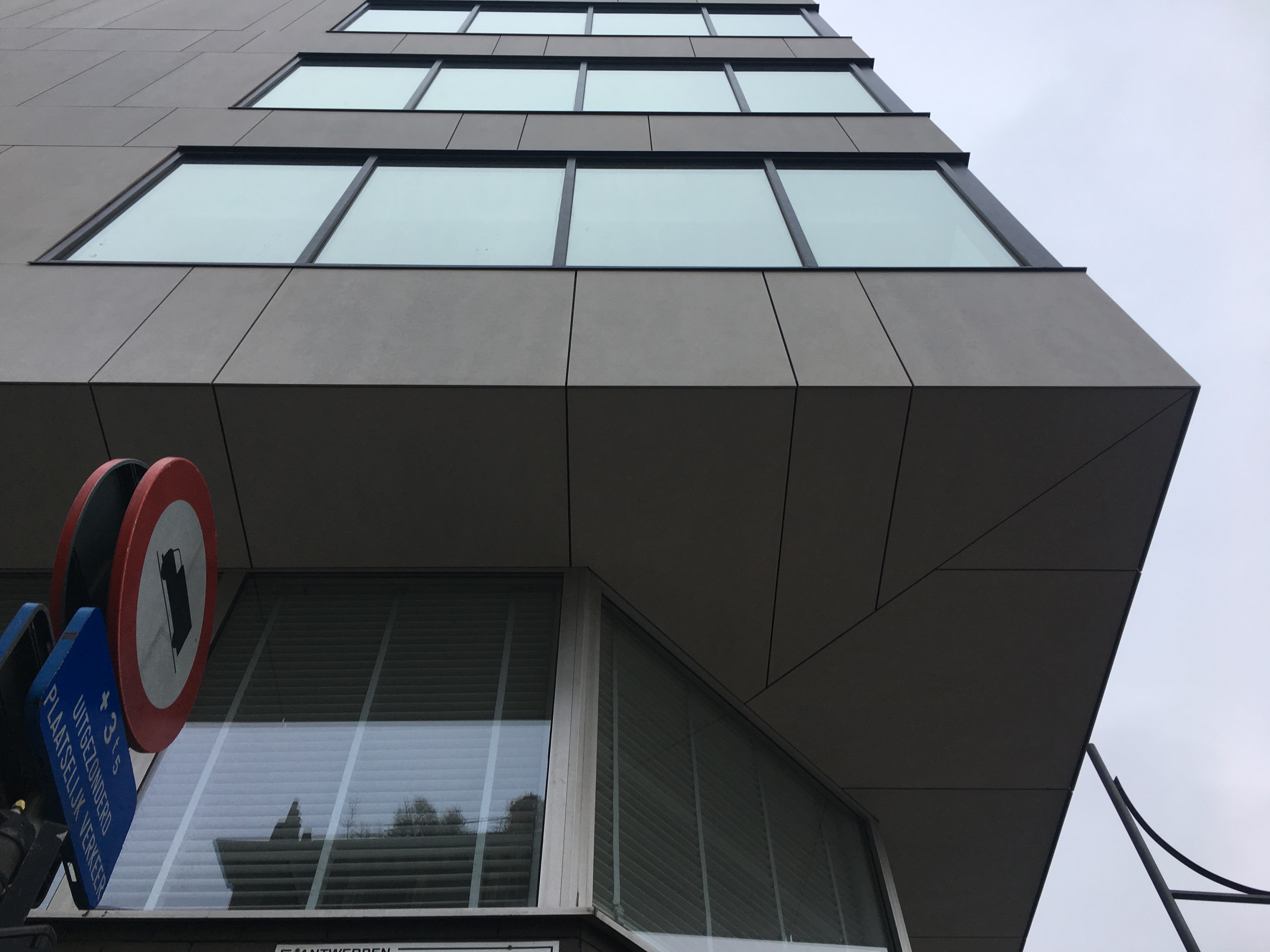 Eternit Equitone Tectiva – Scheldekaaien Antwerpen. Op de hoek van de Scheldestraat en de Cockerillkaai te Antwerpen, hebben we de gevel van deze appartementsblok volledig gestript en terug bekleed. De rotswolisolatie werd vervangen door Kingspan Kooltherm, de houten regels door het Isofinish systeem met gevelschroeven van Borgh, en de multiplex door vezelcementplaten van Eternit. Er werd een zwart regenscherm Tyvek UV-Facade achter de bekleding geplaatst. De gevelplaten werden blind bevestigd op het houten regelwerk met het Innotec lijmsysteem. De waterdichting aan de ramen werd volledig nagezien en indien nodig ook vervangen. Detail: de voegen van de verlijmde plafondbekleding lopen volledig in lijn met die van de gevel