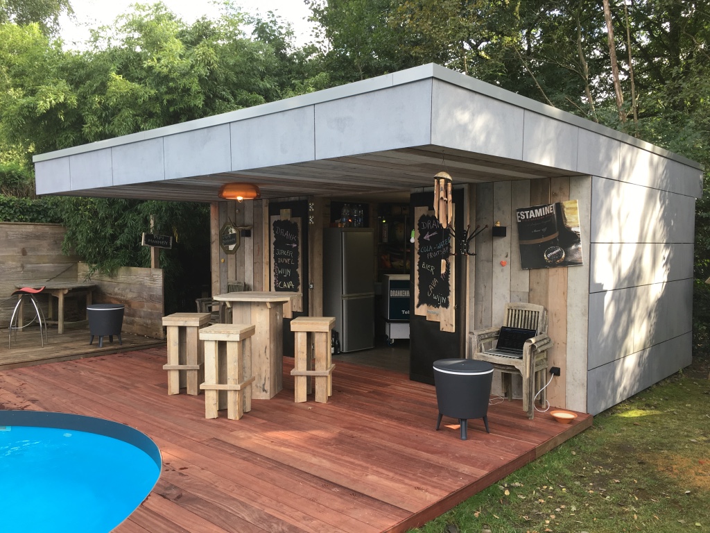 Het poolhouse hebben we ook gerealiseerd en is afgewerkt met Steigerplanken en Equitone Tectiva